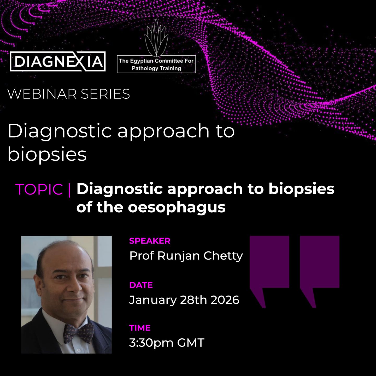 The Egyptian Committee for Pathology Training, in partnership with Diagnexia, will be presenting a webinar series entitled “Diagnostic approach to biopsies” in 2026. The series will principally cover biopsies from different organs and organ systems. The webinars will be planned for the last Wednesday of every month, at 03:30 pm London Time.